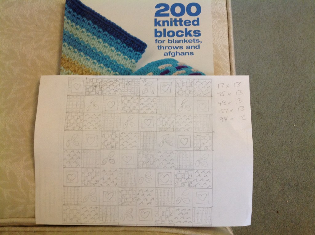 As this was my first time knitting a blanket, I bought a book from Amazon which gave me patterns for 200 different squares and, some months ago, chose 5 different squares and drew a rough blanket plan. Each square is 6″ square, so this blanket was going to be pretty BIG.
