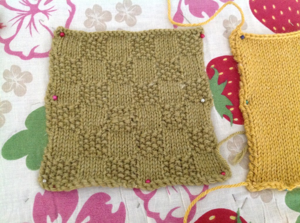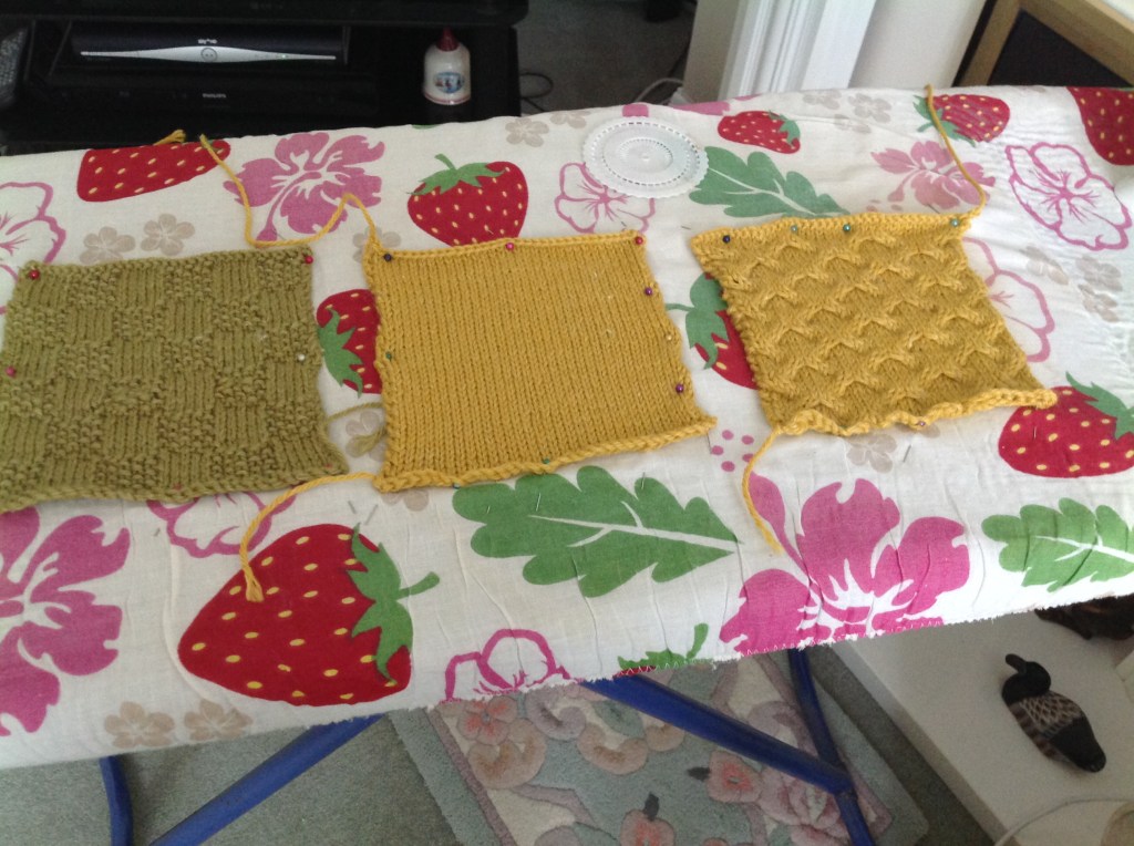 Then I got knitting.  The squares required that I use the blocking method to stop them curling up at all sides. I’d never done this before, as could never be bothered when making my knitted dolls.  It involved pinning the squares to an ironing board, then holding a steam iron over them for a few seconds whilst the steam penetrated the wool; then leaving the squares an age to dry.  I admit here to feeling quite the crafts person of a bygone age, as I laboriously knitted each square and then faffed around with the pinning and the steaming. I wouldn’t be amiss on The Repair Shop.