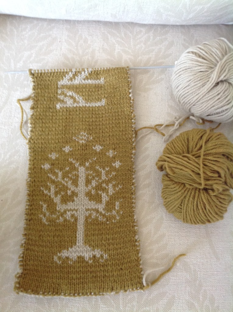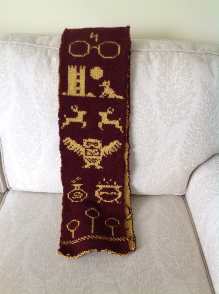 Oh, the frabjous joy when you (well, me) discover the wonders of a new knitting technique. I feel the knitting Gods must have guided my hands when, on a day in the not-so-distant past, I landed upon Harry Potter knitting charts on Ravelry. I think I’d been searching for HP cross stitch charts and Google, in its infinite wisdom, blessed me with knitting charts instead. As is so often my wont, I downloaded the free charts without reading the entire Ravely post. The charts were for a scarf. I decided to knit an HP scarf for son no.2’s 30th birthday. ‘What a marvellous gift this will be,’ I remember thinking. ‘ Why, it’s the sort of gift I wouldn’t mind for myself.’ And so, I began knitting the first chart using intarsia. I soon became overwhelmed with the amount of floating yarn which rapidly built up at the back of my work. ‘This will look rubbish on a scarf,’ I internally wailed. ‘Nobody in their right mind would want to sport such a hideous object,’ thought I. ‘Further more this scarf is going to be tiny!’ It was coming out roughly 4” wide. Clearly something was drastically amiss.